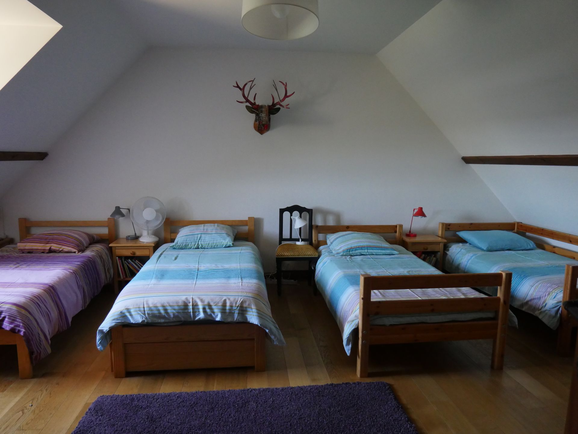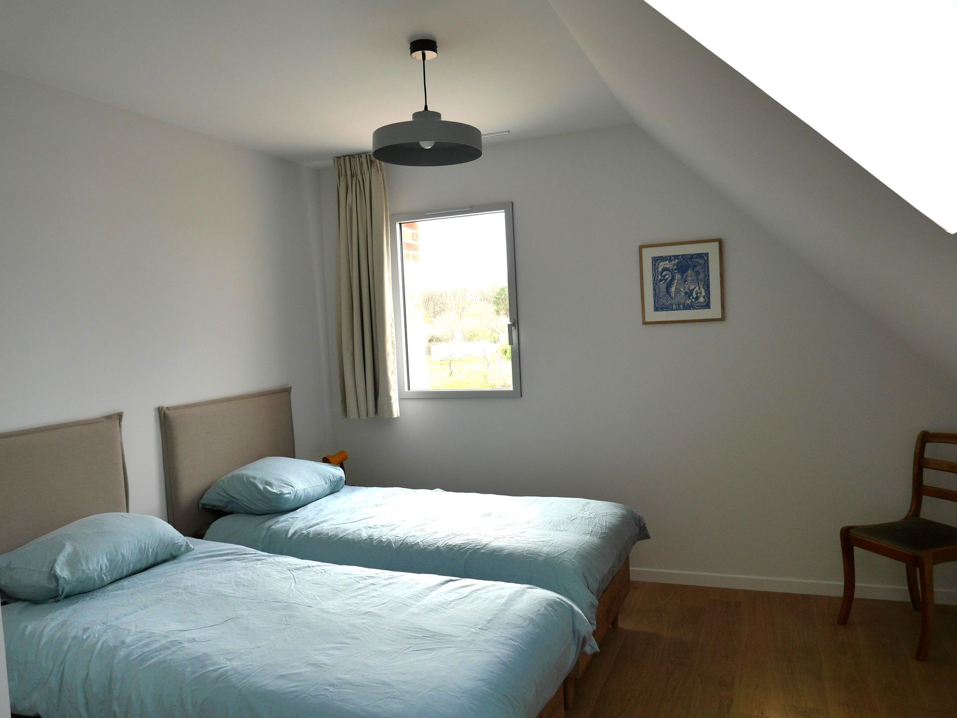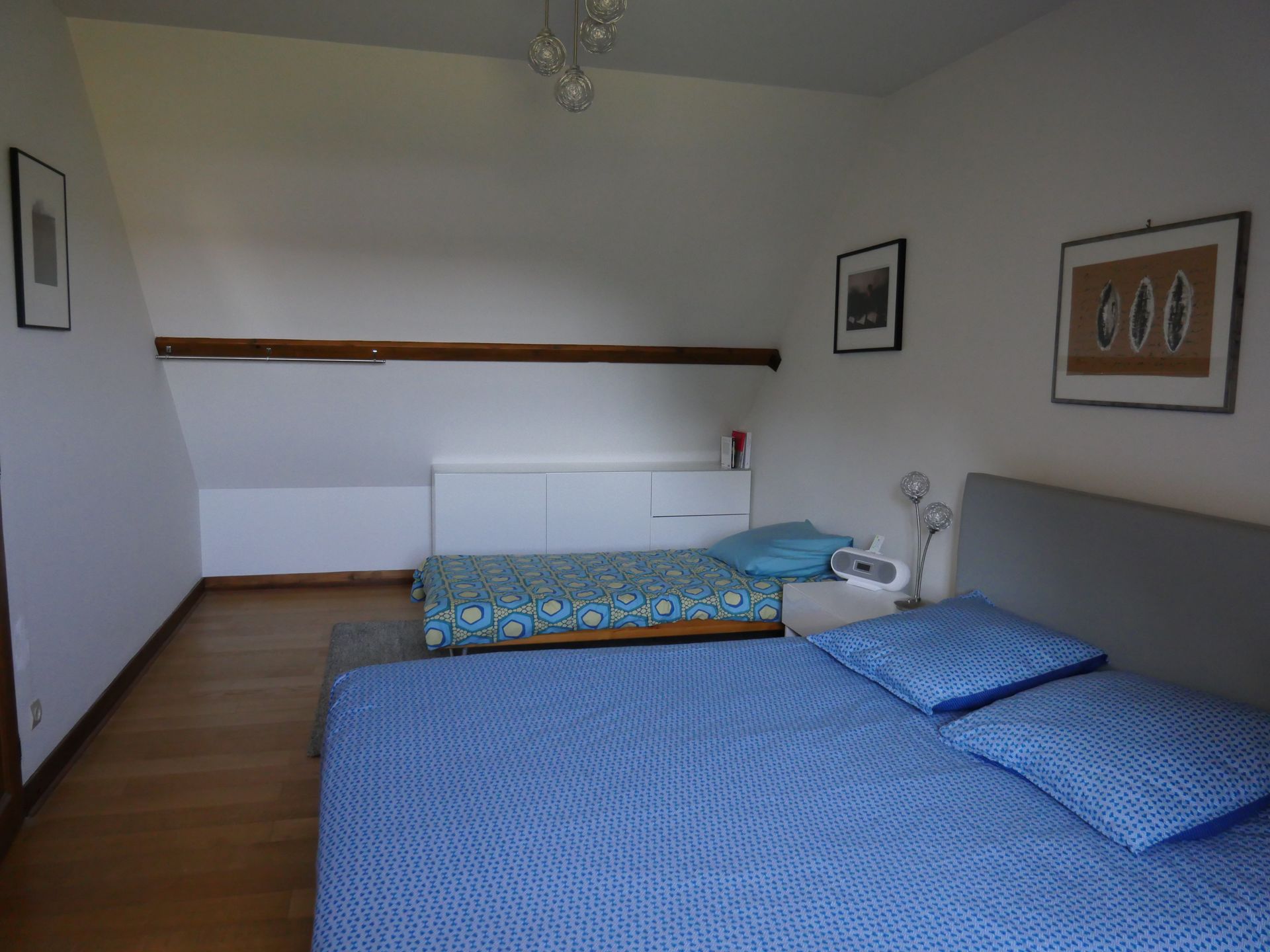 Au 1er étage, mansardé, vous pourrez choisir l’une des 2 chambres avec un lit double ou celle avec 2 lits simples. On y trouve également une salle d’eau avec une belle douche et des WC indépendants.