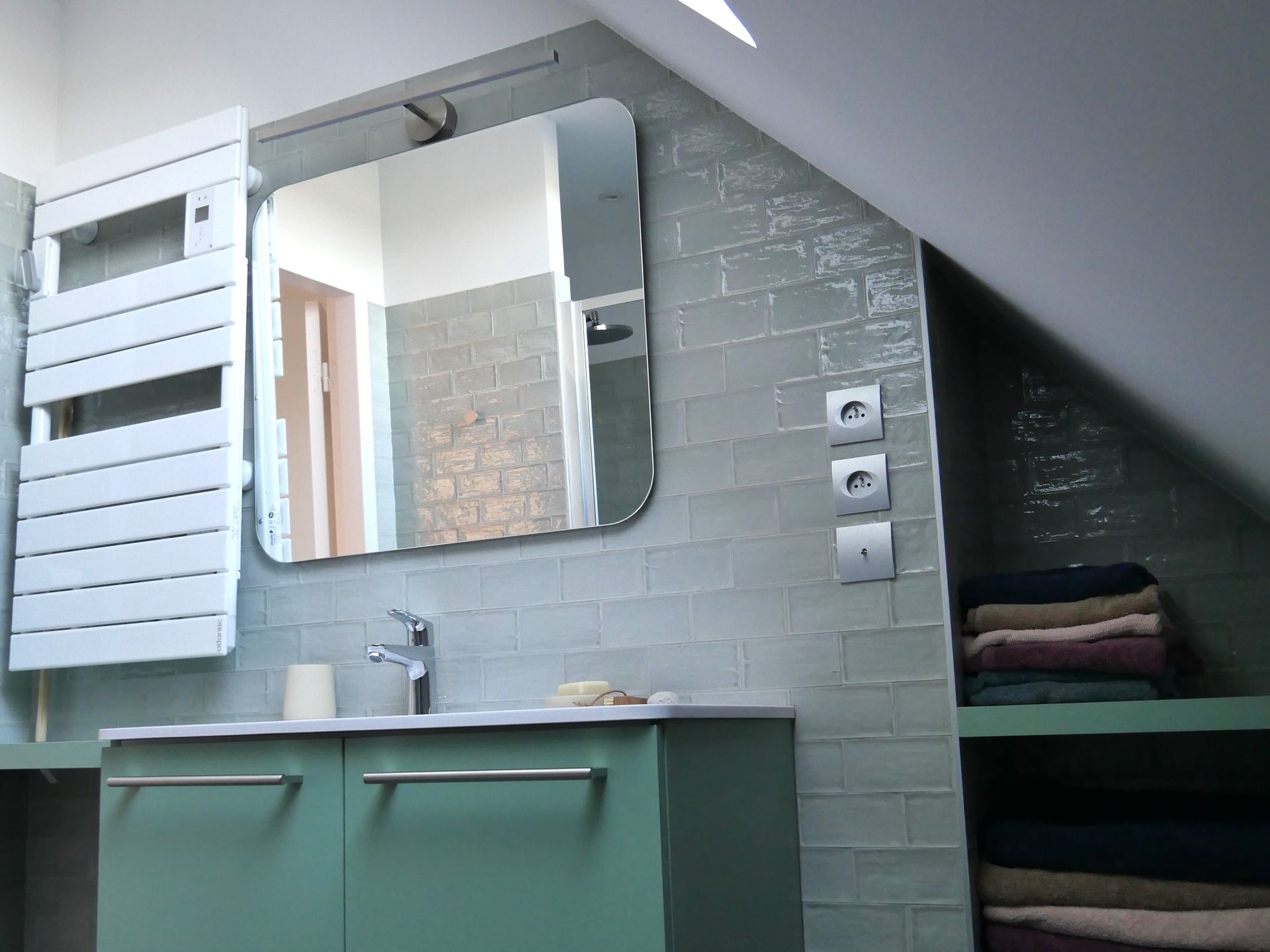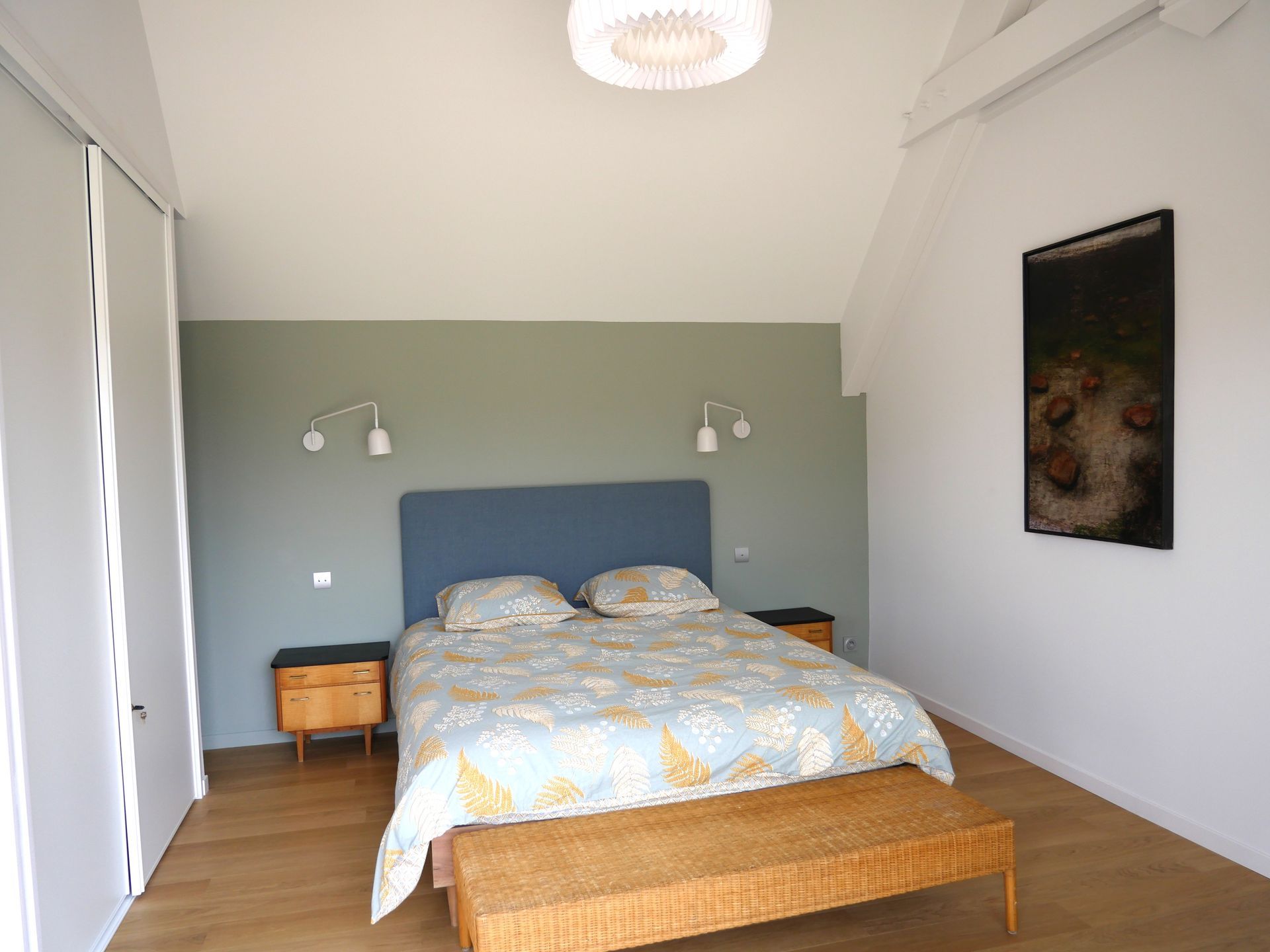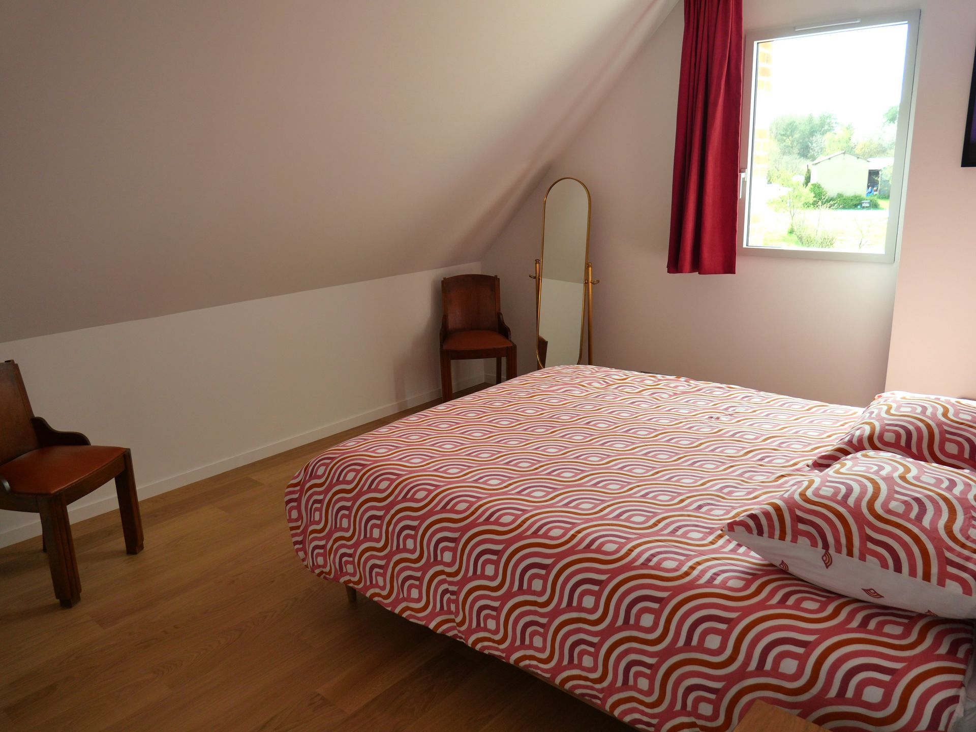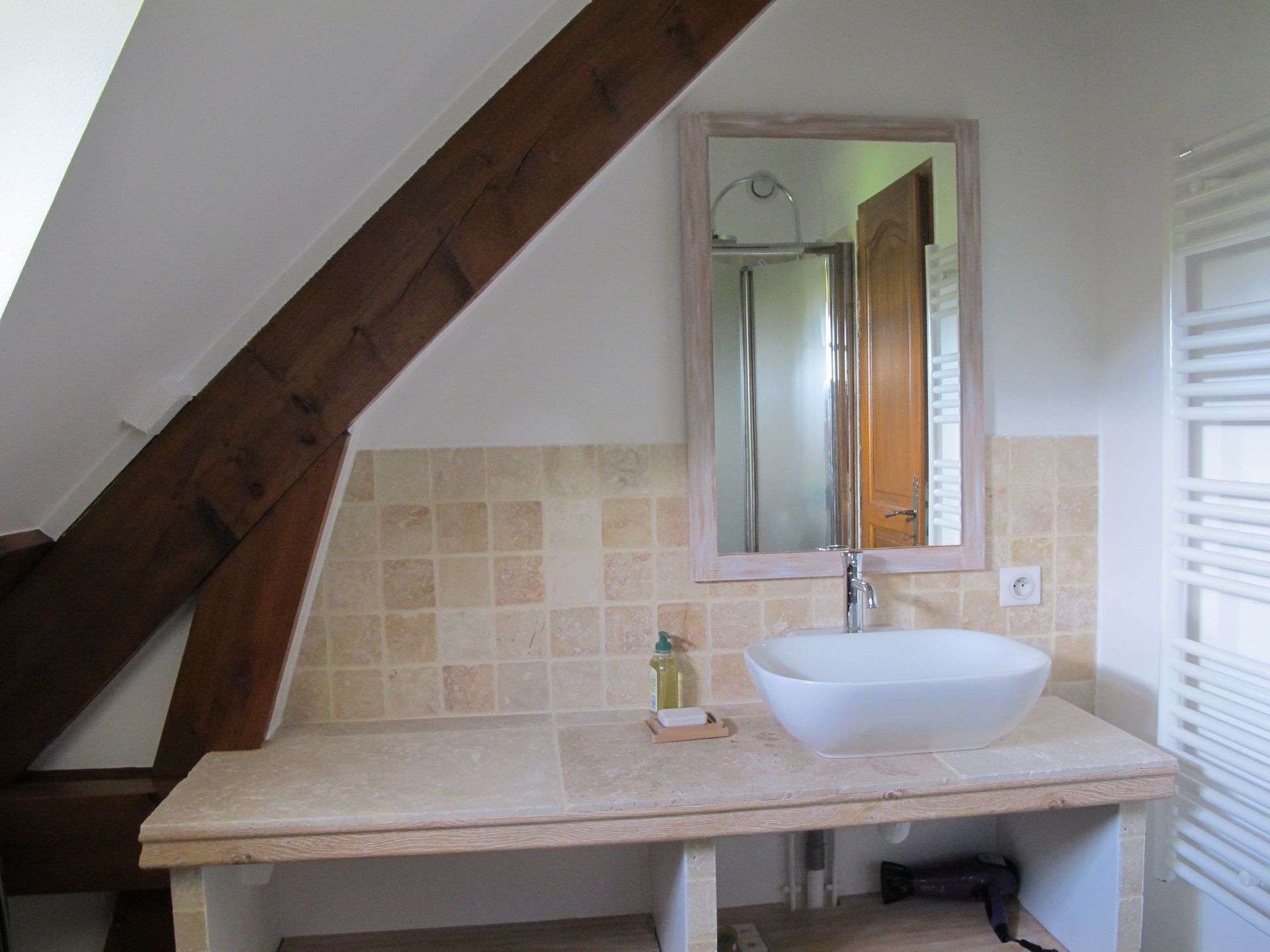 Au 1er étage, mansardé, vous pourrez choisir l’une des 2 chambres avec un lit double ou celle avec 2 lits simples. On y trouve également une salle d’eau avec une belle douche et des WC indépendants.