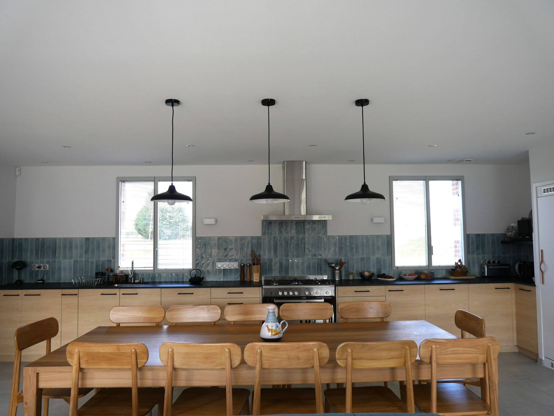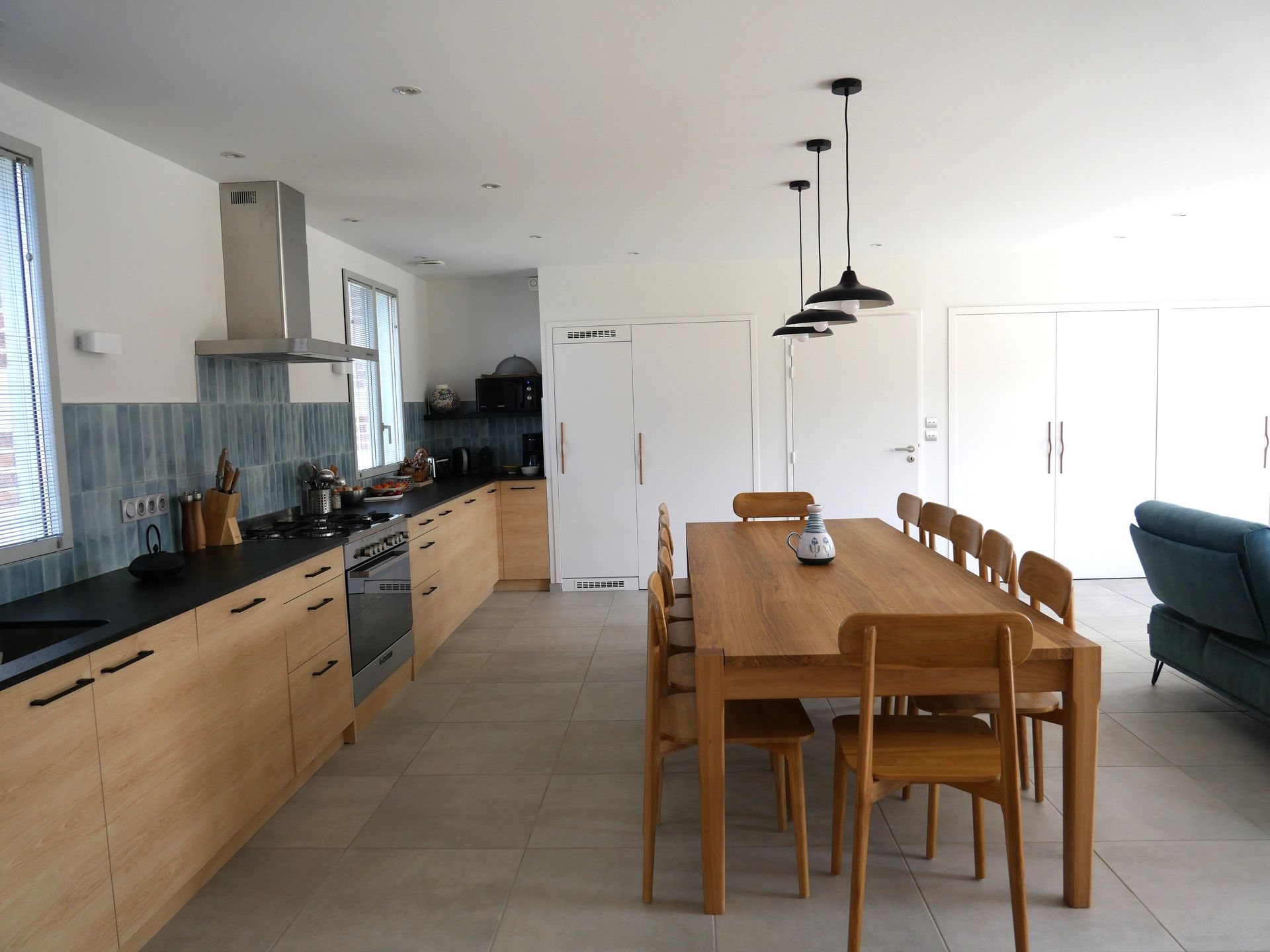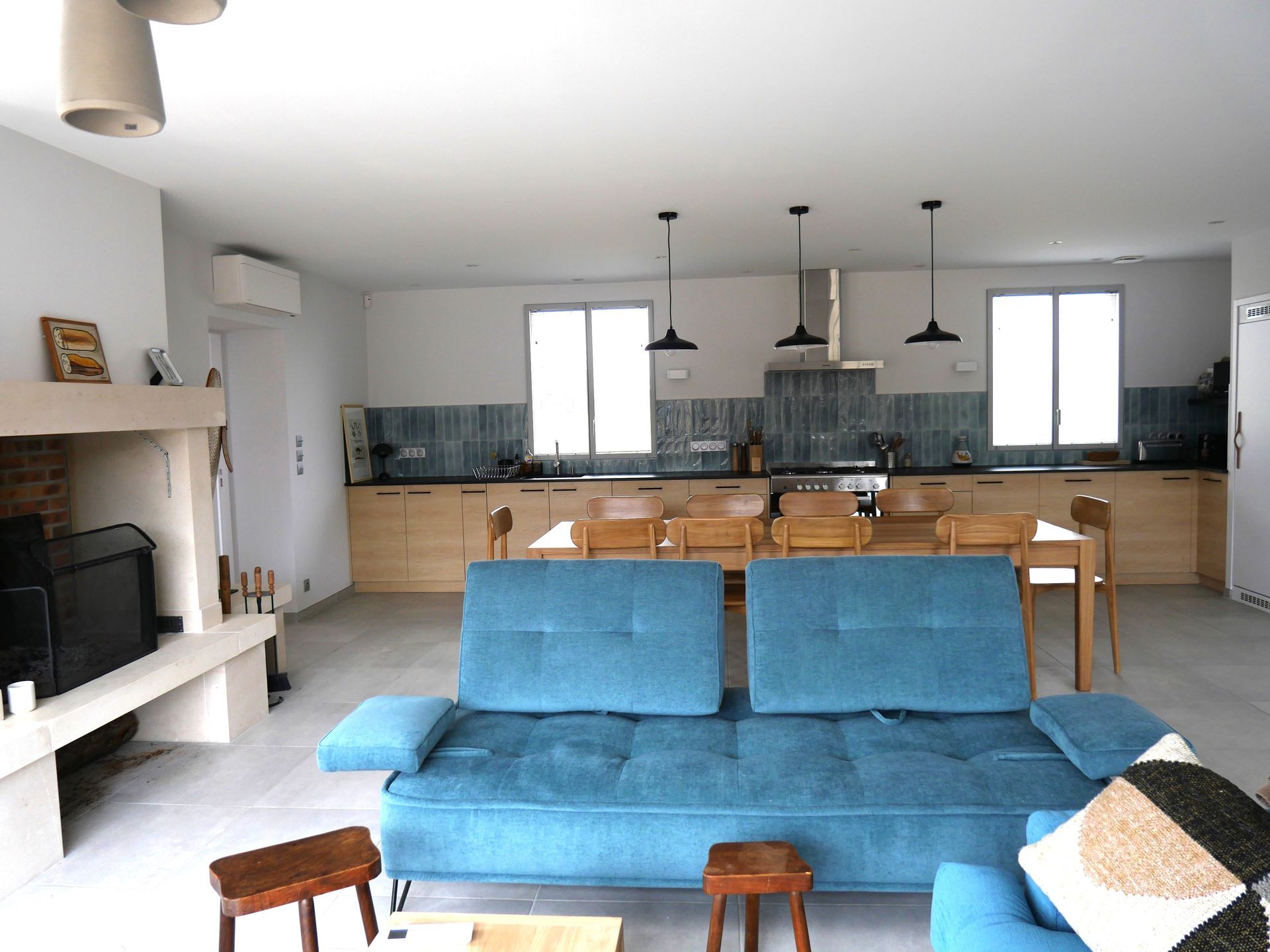 Le parti-pris est la convivialité avec une grande pièce principale de plus de 50 m2 comprenant une cuisine linéaire sur toute la longueur de la pièce, une partie salle à manger pour 12 personnes avec une magnifique table en chêne massif, une belle cheminée ouverte et un salon chaleureux ouvert sur la terrasse grâce à la grande baie vitrée.