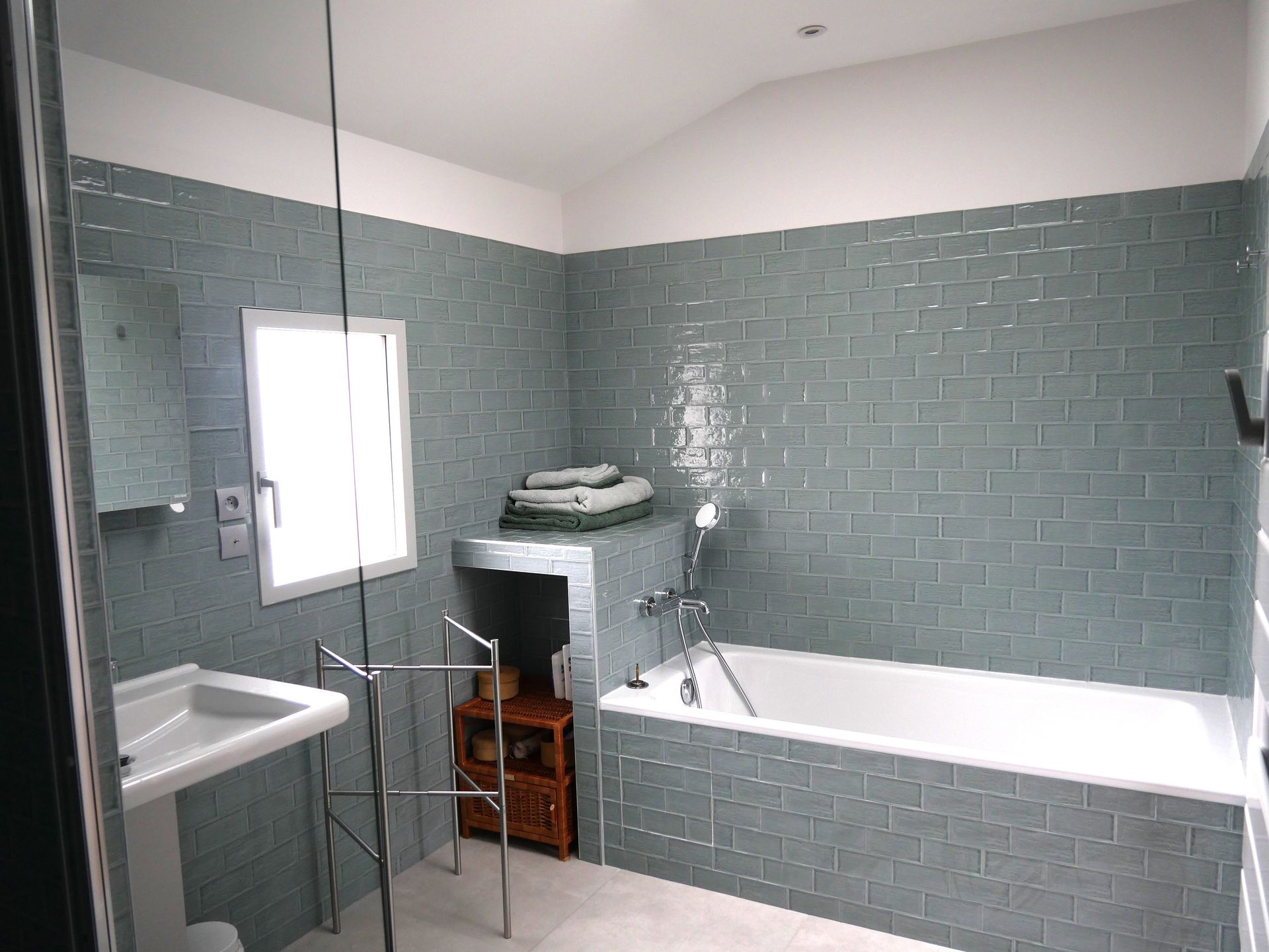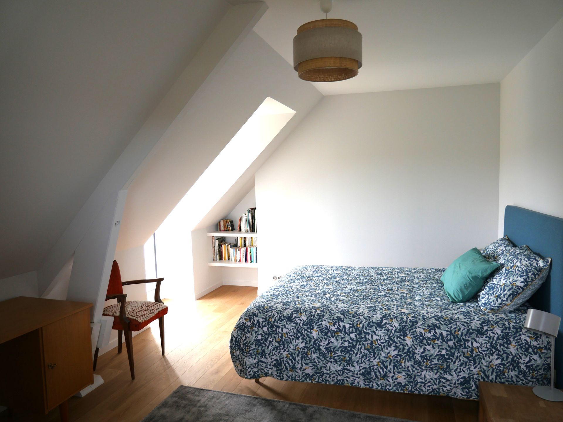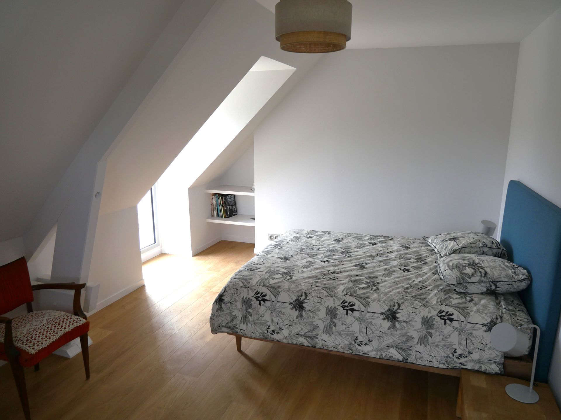 Au RDC, une très belle chambre avec un plafond cathédrale donne sur le jardin. La salle de bain attenante dispose d’une grande douche à l’italienne et d’une baignoire.