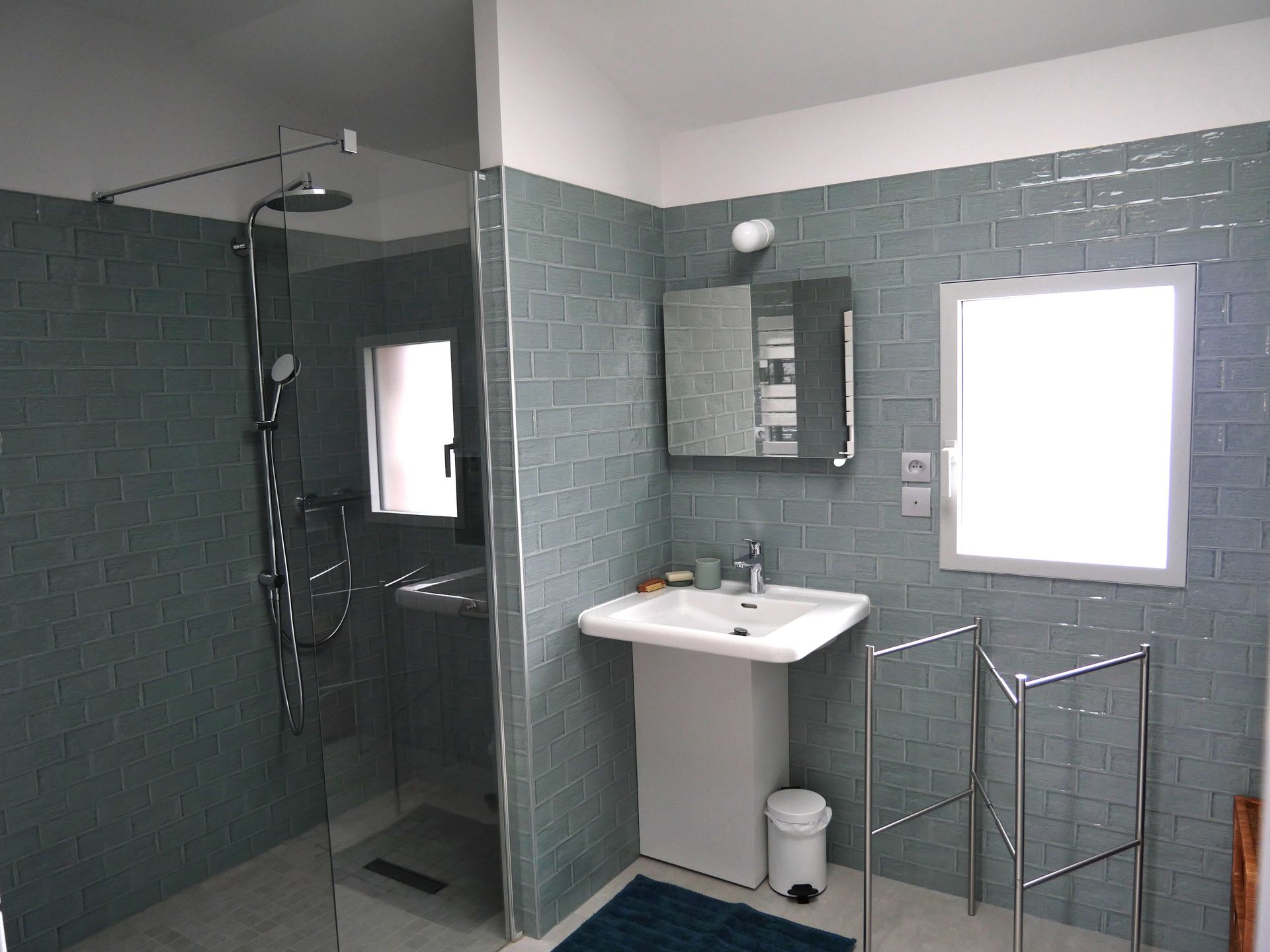 * Une salle de bain avec baignoire et 2 lavabos et une salle de douche avec lavabo.