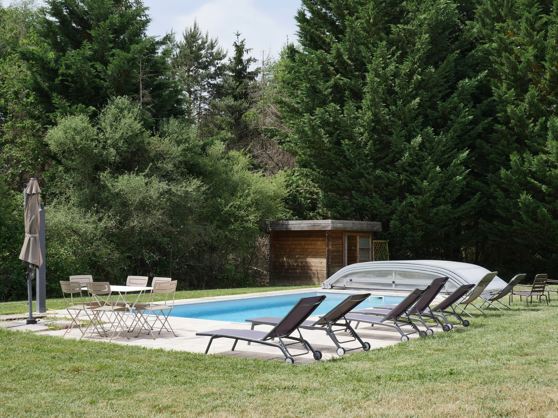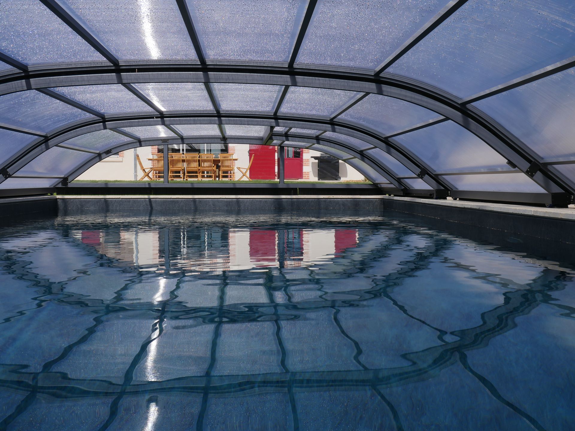 La piscine avec abri bas permet des baignades même par temps pluvieux ou venteux ; ouverture d’avril à octobre.