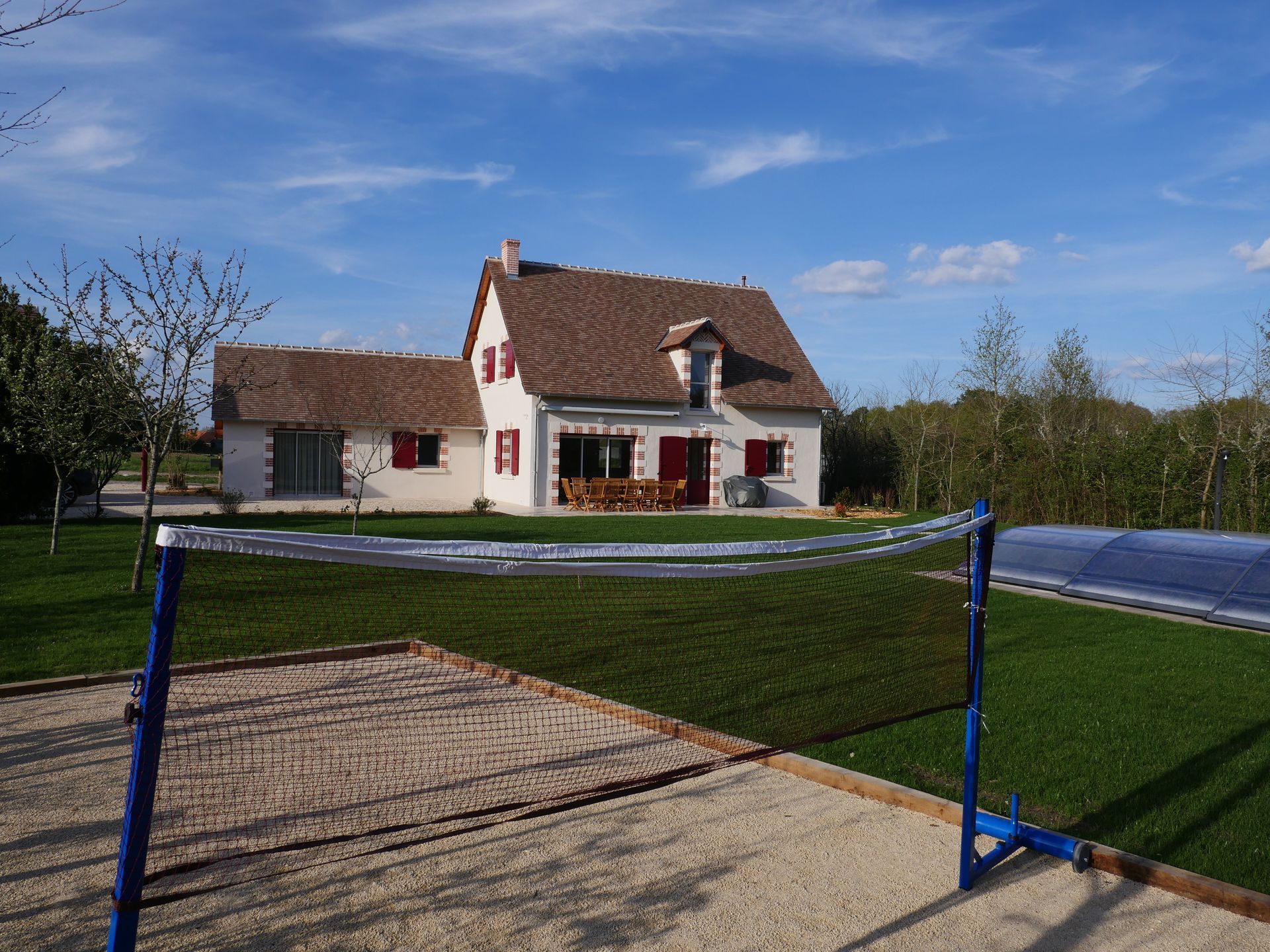 A proximité de la maison, une piscine chauffée (11 x 5 m) avec couverture électrique sécurisée ouverte d’avril à octobre (selon la météo) et un portique avec agrès pour le plaisir des petits et grands.