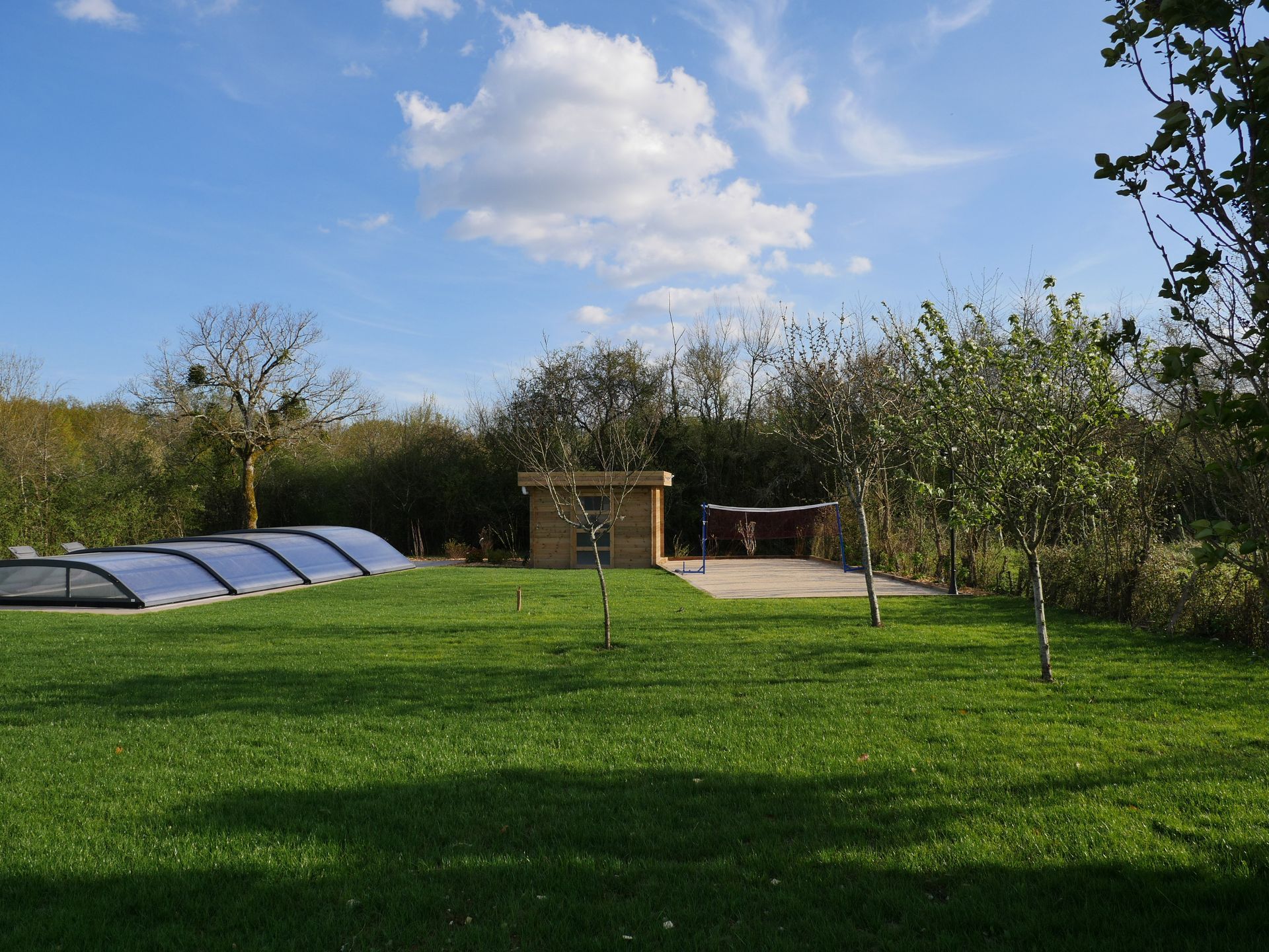 Vous pourrez vous baigner dans la piscine à fond plat (8 x 4 m) avec l’abri bas ouvert ou fermé, puis faire une partie de pétanque ou de badminton avant de lancer un tournoi de ping-pong.
