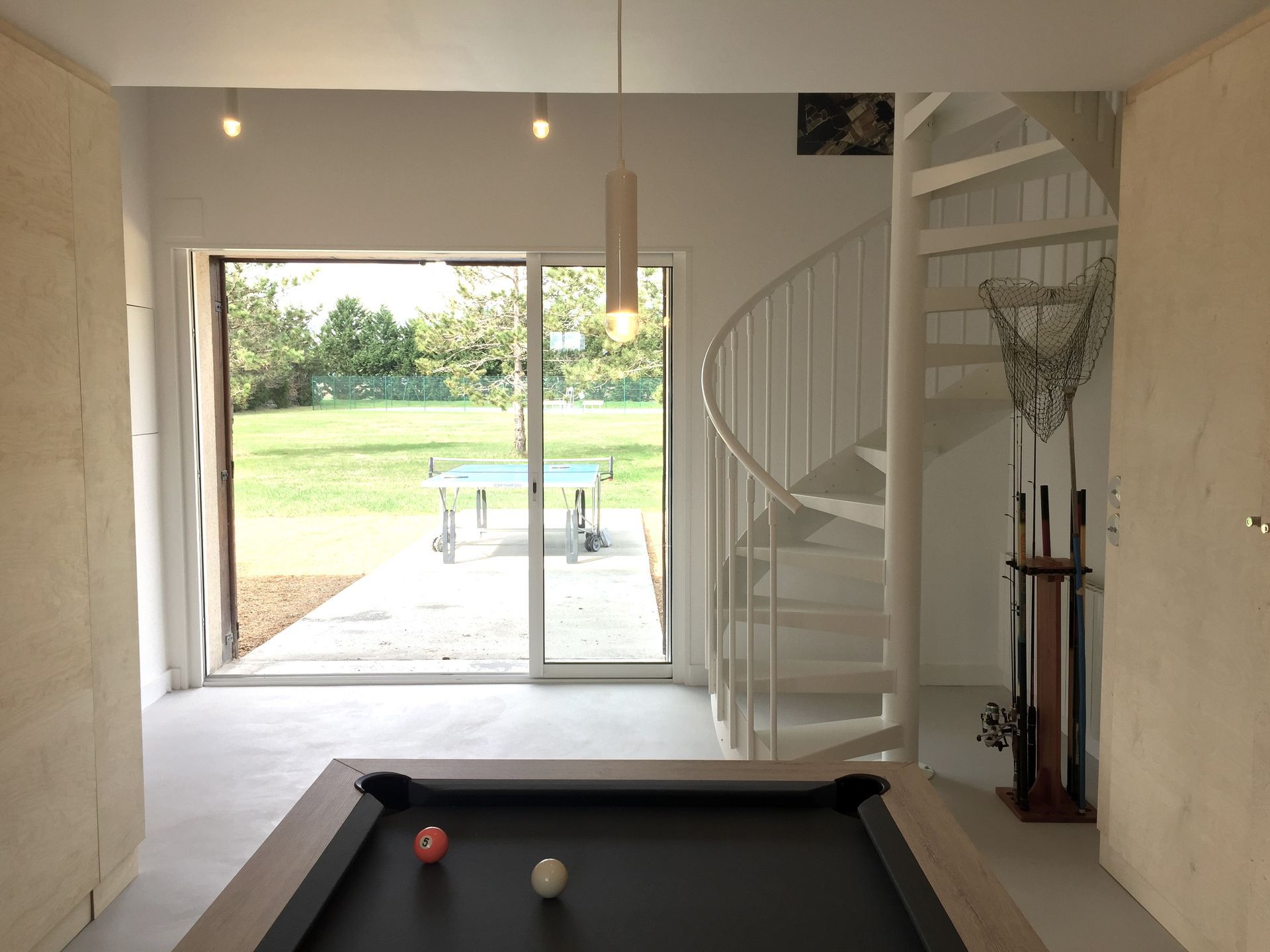 La salle de jeux contemporaine invite à jouer au billard. Ses grands placards cachent aussi bien des jeux de société, des raquettes de tennis qu’un frigo, des grandes casseroles ou un lave-linge. Son escalier en colimaçon mène au salon TV qui peut devenir une 4e chambre grâce à son canapé-lit pour 2 et au rideau qui l’isole du RDC.