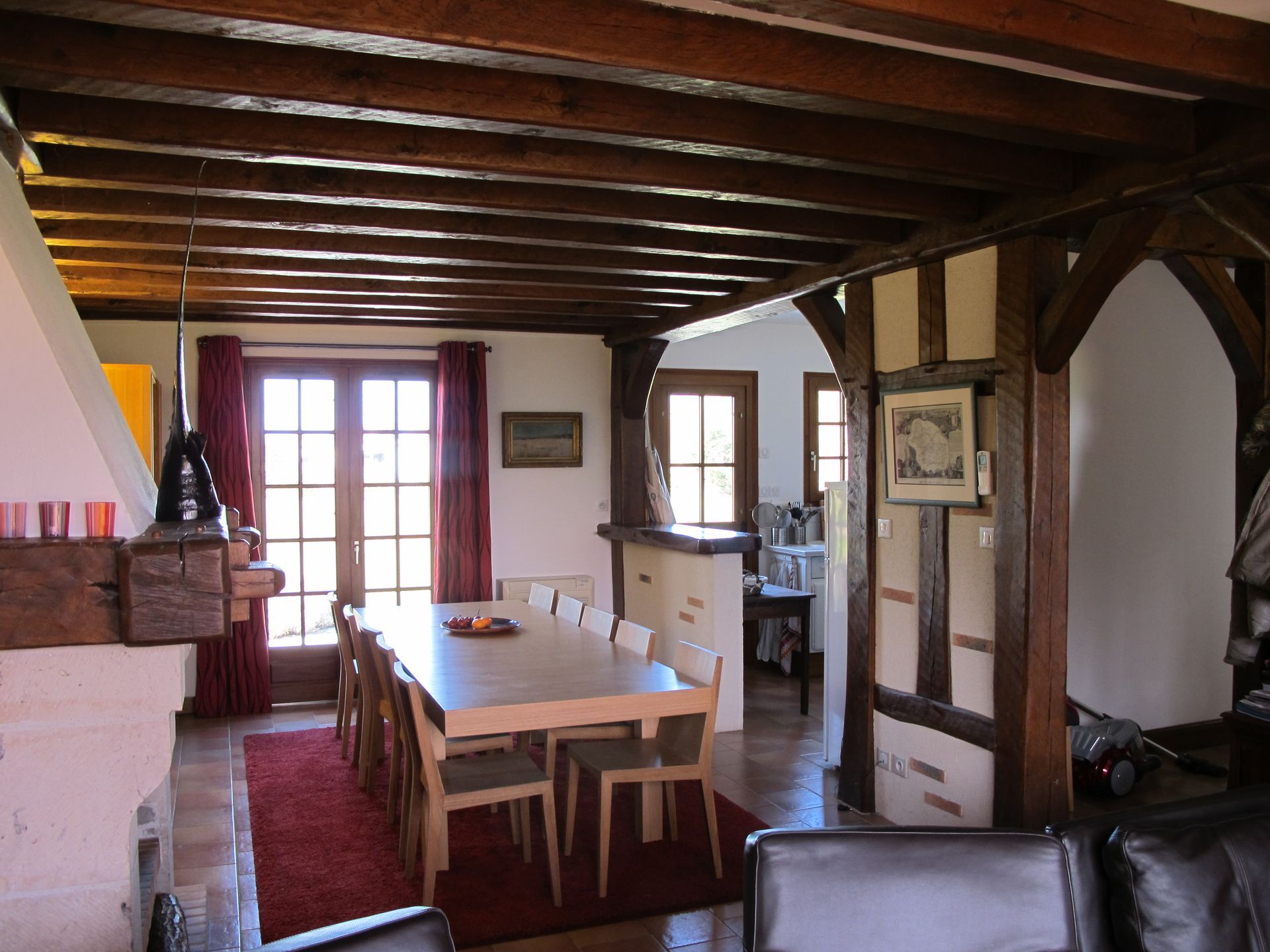 La pièce principale, décorée dans un style traditionnel solognot, dispose d’une cheminée ouverte très agréable donnant sur le salon équipé d’une chaine hifi (33 tours), d’une enceinte Bluetooth et d’une tv.